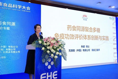 会上,无限极前沿技术高级研究员朱颖博士带来了《药食同源复合多糖免疫功效评价体系创新与实践》主题报告。她用详实的实验数据,深入解读了复合多糖在免疫调节领域的核心作用。