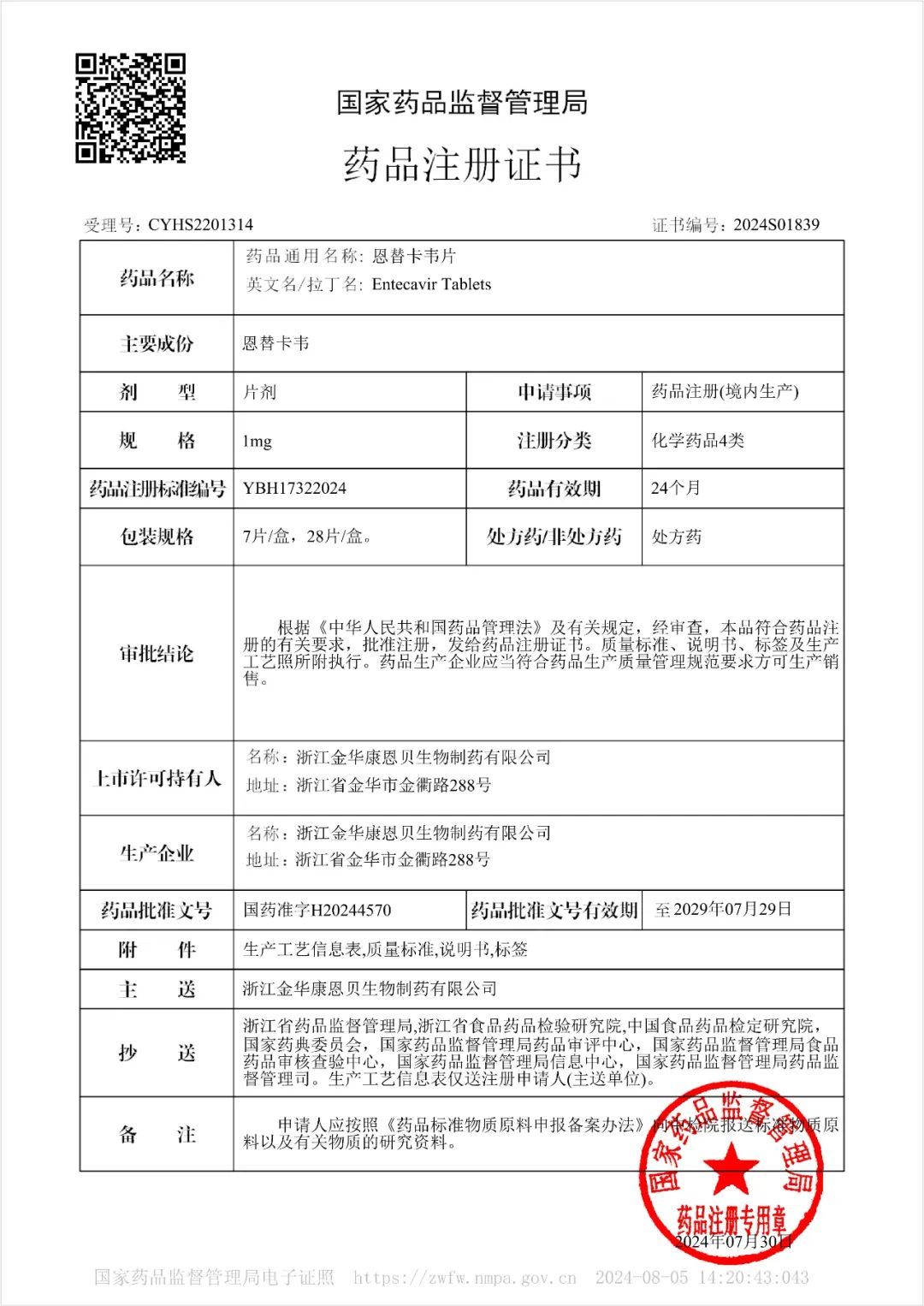 金华康恩贝于2022年8月向国家药监局药品审评中心递交了规格为0.5mg、1mg的恩替卡韦片的药品注册申请并获得受理,并于近日获得国家药监局核准签发的该两个规格的《药品注册证书》。